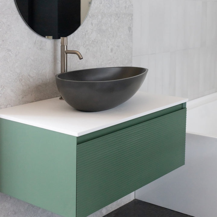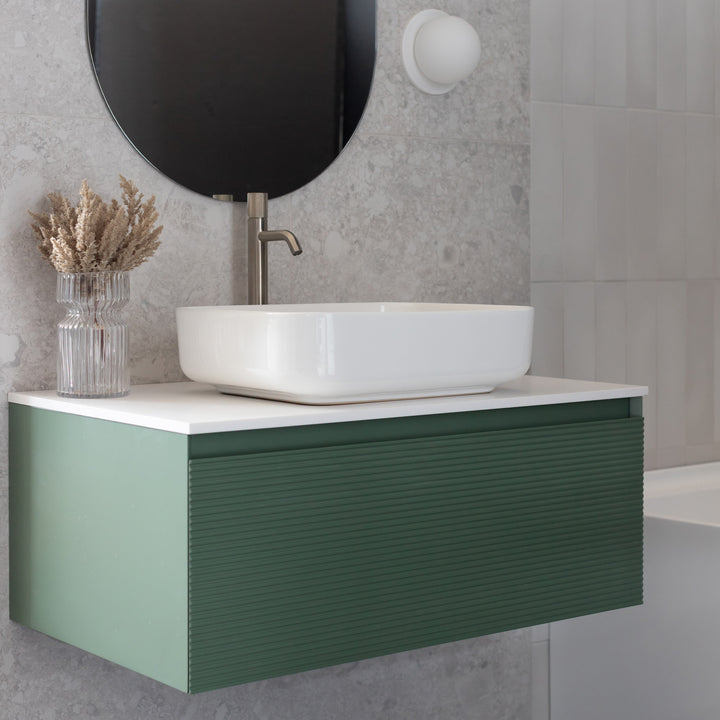 Taille : 35 1/2’’ x 21 5/8’’ x 14 3/8’’ Armoire avec 1 tiroir. Devant de tiroir en placage de bois laqué vert #M031. Ouverture en forme de U pour la tuyauterie. Pas de trous percés sur le comptoir. Choix de robinet mural ou à un trou. Évier, robinets et drain : non inclus. Comptoir en surface solide, finition blanche mate. Intérieur de tiroir premium en gris foncé. Glissières de tiroir à fermeture douce.