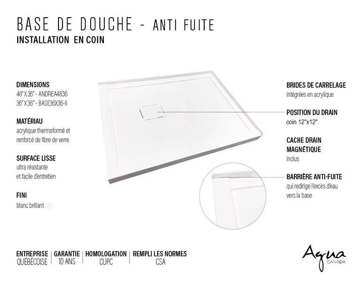 ["36\"x36\"","36\"×36\"","alcove installation","AVAILABILITY:Pre order","AVAILABILITY_In stock","Category_Aqua Canada\/Salle de bain","Category_Aqua Canada\/Salle de bain\/Douches","Category_Aqua Canada\/Salle de bain\/Douches\/Bases","Category_Aqua Canada\/Salle de bain\/Douches\/Bases\/En alcôve","drain central","installation dans le coin gauche","installation en angle droit","installation en coin droit","Installation en coin gauche","Lisse","marque_Agua Canada","no_promo","Preorder","Smooth","USA-NO-SHOW"]