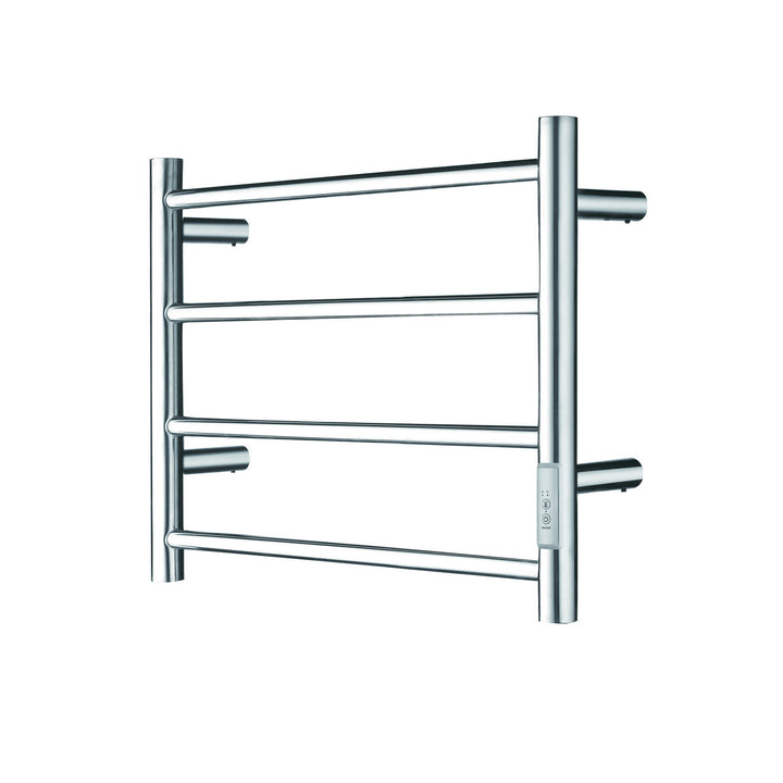 Porte-serviettes chauffant mural à 4 barres Fabriqué en acier inoxydable pour une excellente durabilité. Installation murale directe ou branchement sur une prise électrique Installation requérant un électricien Minuterie intégrée avec 3 modes : MARCHE / ARRÊT, 2H et 4H Alimentation électrique : 80W AC 120V / 60HZ Température moyenne de la surface des barres : 55°C (131 °F) Température maximale atteinte après 15 minutes Technologie de fil chauffant Convient pour 1 à 2 serviettes de taille standard (pliées) Silencieux Facile à installer Forme ronde