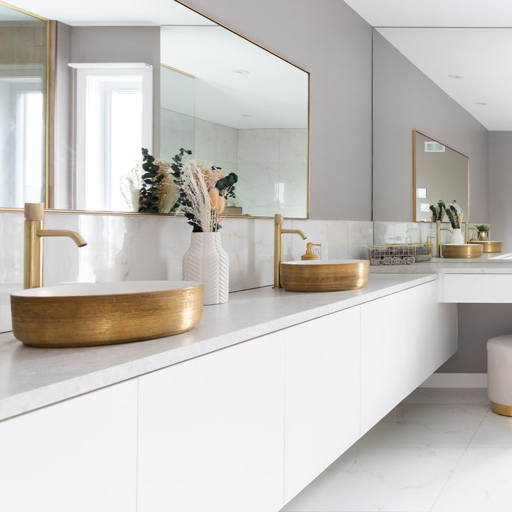 Soyez tendance avec le robinet ROSABELLA-GD. Son bec allongé et haut permet plus d'espace entre l'évier et le robinet, faisant du lavage des mains une expérience plus confortable. Sa cartouche en céramique et sa construction en laiton massif rendent le robinet très durable. Complétez votre lavabo avec ce robinet élégant et minimaliste !