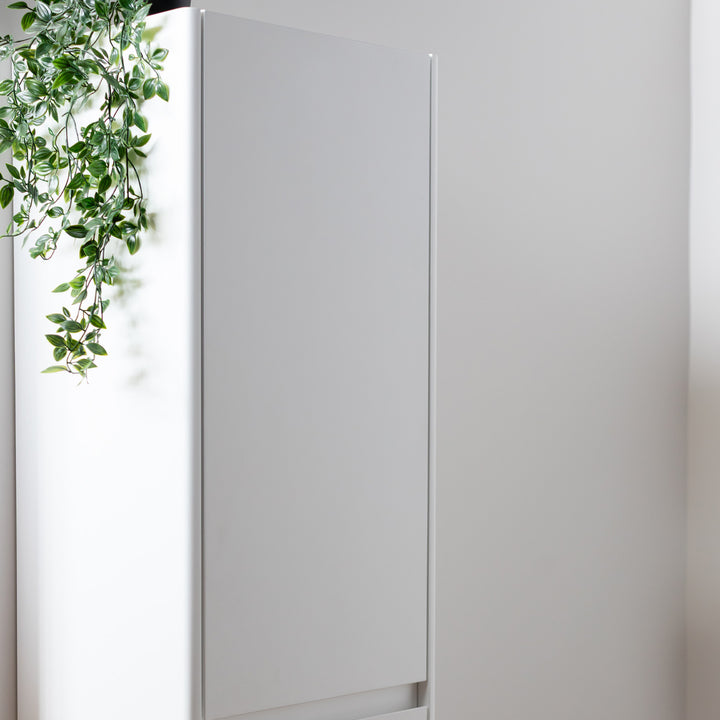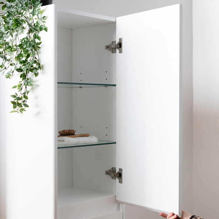 The IRWIN hanging linen cabinet features an elegant rectangular design with removable glass shelves and two doors, making it an aesthetically pleasing storage unit for any modern or classic interior decor.