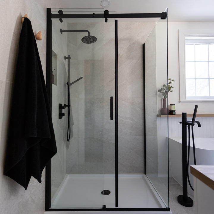 The CLD-48BK-III is more than just a shower door - it’s a statement of style for your bathroom. Designed as a 48" alcove sliding shower door, it’s perfect for creating a clean, modern look in an alcove setting. But its versatility goes even further: for corner showers, you can pair it with a 32" or 36" return panel to build a bright, spacious layout that feels open and inviting. Every detail is made to enhance your daily routine. The smooth sliding system glides effortlessly on high-quality wheels, while the tempered glass adds both elegance and durability. Thanks to the Aquapel treatment, keeping the glass clear and spotless is almost effortless, so your shower always looks fresh. Inside and outside handles bring convenience, and discreet seals between the elements ensure everything feels perfectly finished. With its modern lines and thoughtful details, the CLD-48BK-III transforms your shower into a space that’s as practical as it is beautiful - an everyday upgrade that makes your bathroom feel like a retreat.