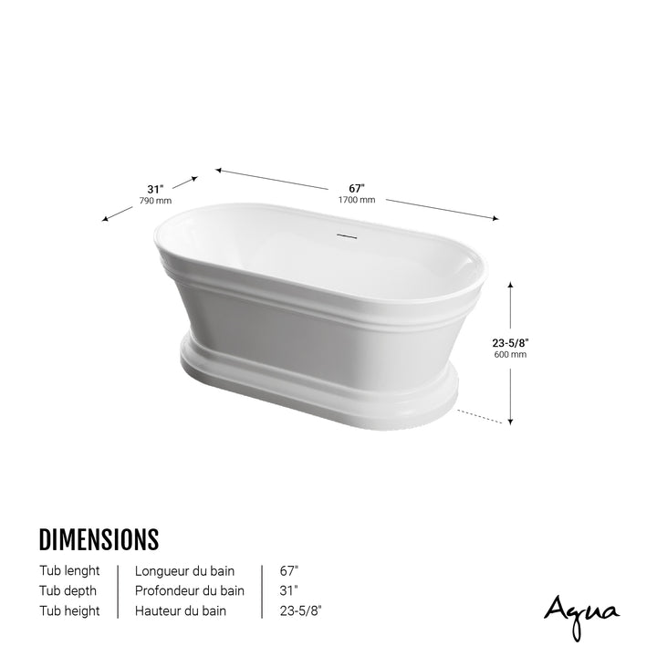 • Size: 67’’ x 31‘’ x 23-5/8‘’ • Acrylic material made bathtub and reinforced with fibreglass • Glossy white finish resists stains and discoloration • High thermal water heat retention • 269 L ( 71 US gal) water capacity • Immersion point: 15-3/16’’ • Laser-cut overflow • Return pipe of the overflow molded in the fiberglass in order to eliminate the possibility of water damage • Integrated matte white drain system (pop-up) included • Center drain system • Drain seperate from bath, in a box under the bathtub • Adjustable leveling legs under the tub • Compatible with wall-mounted faucets and freestanding faucets (not included)