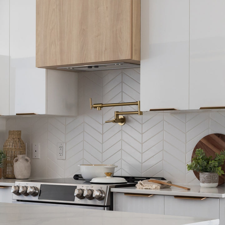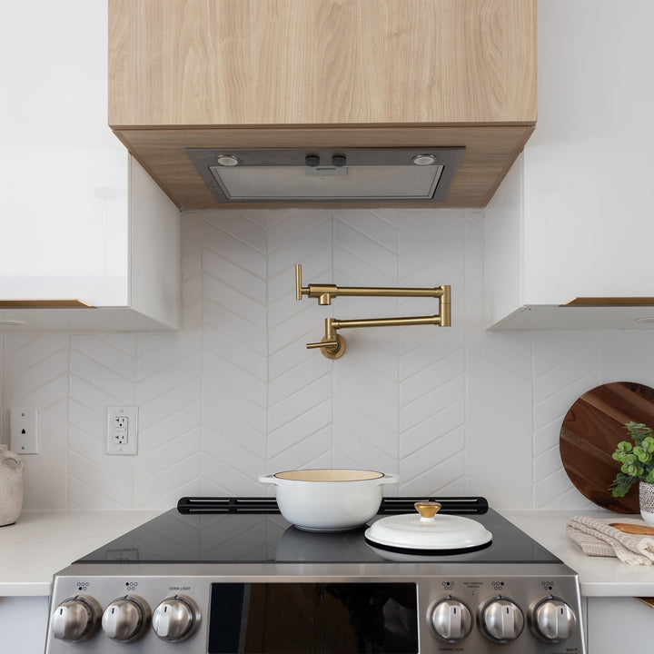 The MANNOX-GD Pot Filler is the ultimate luxury, ensuring convenient flow control over a cooktop. Dual joints allow for maximum reach, and dual shutoff valves mean never reaching over a hot surface to turn it off. This beautiful faucet will add character and personality to your sink with its gold finish.