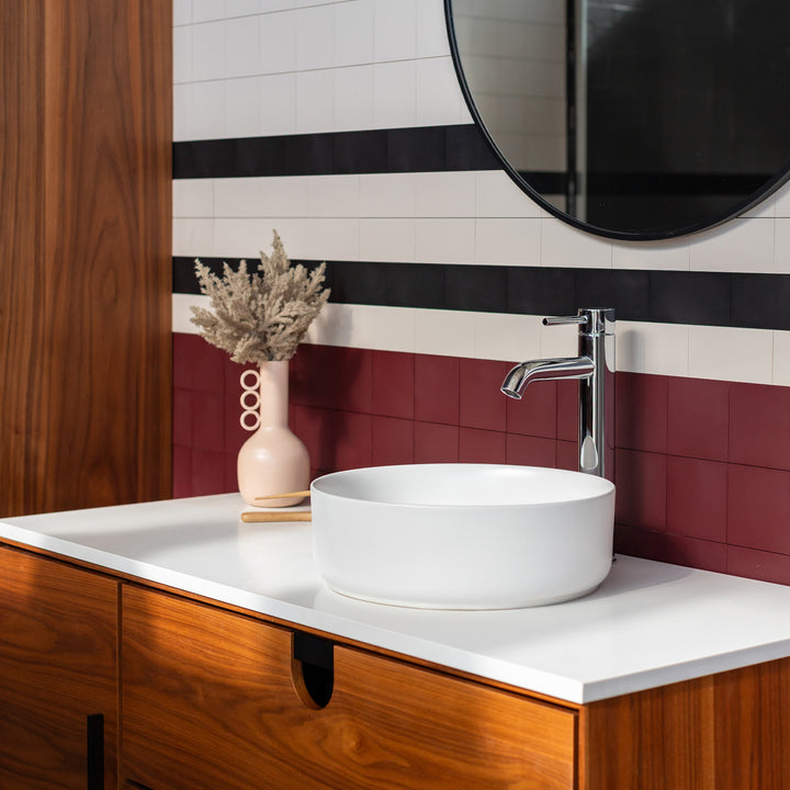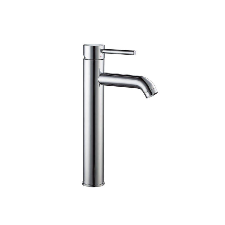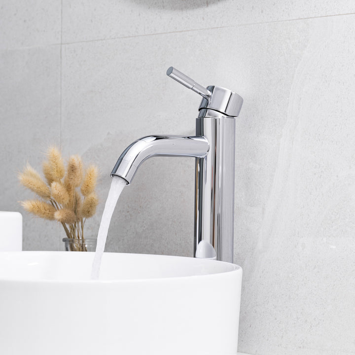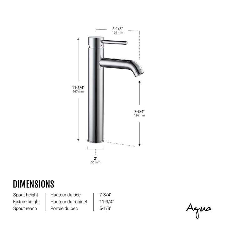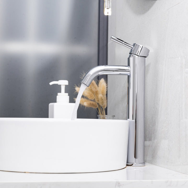 Simple and trendy, this tall bathroom faucet features a high spout, ideal for vessel sinks or sinks without faucet holes. The single handle facilitates temperature and flow control as well as creating a unique and cleaner look. Thanks to the sold brass body and the ceramic cartridge, the durability of the product is ensured.