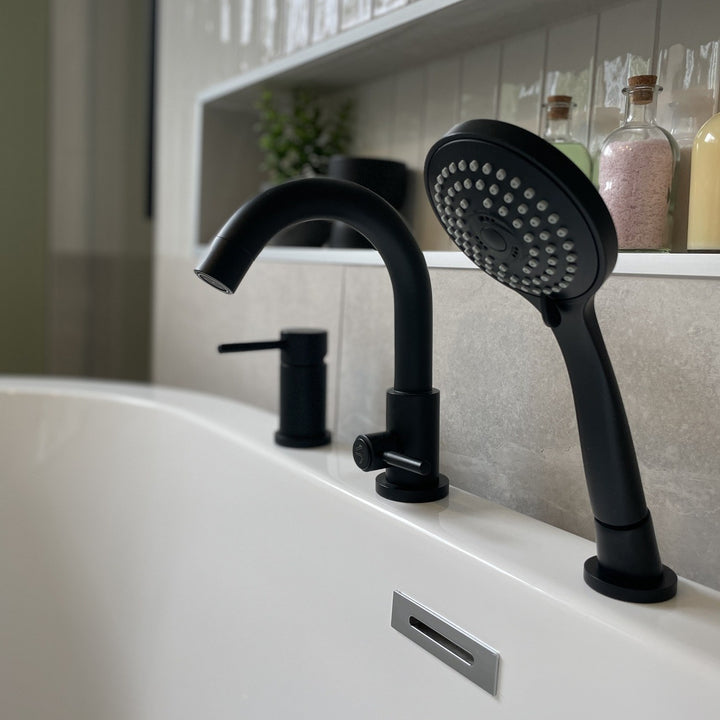 Discreet and useful, this 3 piece faucet is an ideal option for your bath. Its unique handle facilitates temperature control and its hand shower will be a real ally for rinsing. The solid brass construction,the ceramic cartgride and the 1/2'' flexible hose ensure the durability of the faucet. SANTO-BK is a perfect addition to the bathroom and will last for many years!