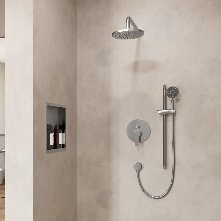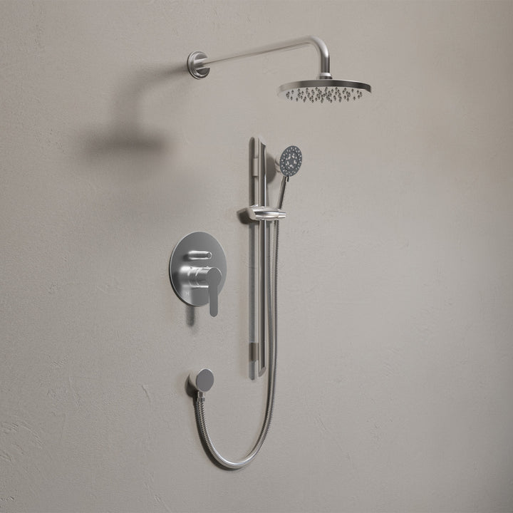 Complete your bathroom by adding this 2-function bath shower faucet. This set includes the rain head shower, the hand shower and rail, the valve and the diverter. The ceramic cartridge and the solid brass body ensure the longevity. VIENNA is the perfect design for a modern-style bathroom.